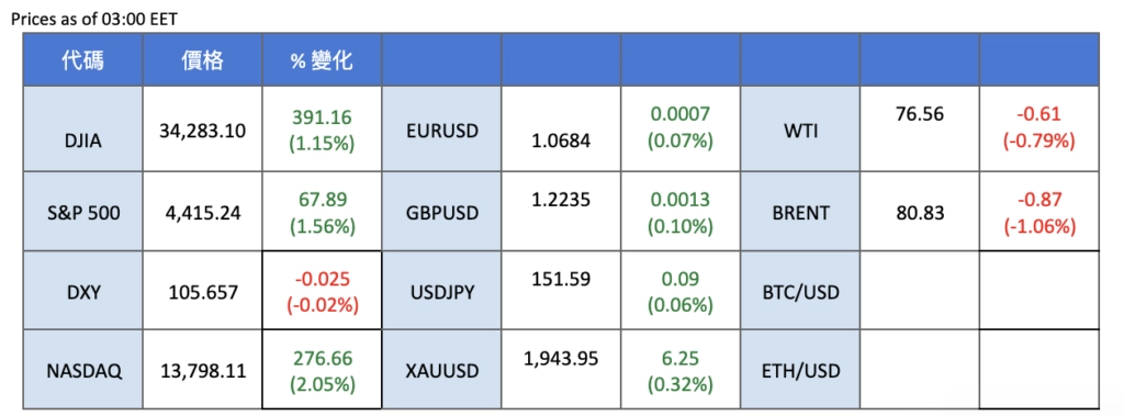 受美联储成员的鹰派情绪推动,美元大幅反弹,旧金山联邦储备银行行长玛丽·戴利尤其表示美联储仍然需要延续紧缩货币政策,目前通胀还未完全减缓。该鹰派言论促使黄金价格的显著回落,与美元的强势相呼应。目前而言,投资者正密切关注美国10月份的消费者价格指数(CPI)数据,以了解美联储应对通胀的策略。与此同时,英镑在积极GDP经济数据中表现出弹性,油价在欧佩克+减产预期的推动下小幅反弹。美国股市复苏,但穆迪对美国信用评级的负面展望引发了谨慎。