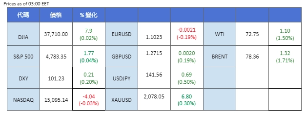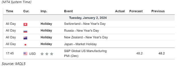 美元在新年假期回来后的第一个交易日继续上涨。所有目光都集中在定于明天公布的美国采购经理人指数 (PMI) 数据上,在人们对美联储 2024 年初降息的强烈猜测中,该指数将在衡量美元强弱方面发挥至关重要的作用。股市在 2024 年第一个交易日开盘走低,未能满足圣诞老人反弹的预期。与此同时,随着红海紧张局势升级,胡塞武装在红海部署军舰以回应美国海军的行动,油价小幅上涨。市场预计,由于红海紧张局势升级,石油供应可能会出现短期中断。