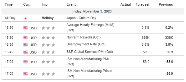 由于预计今天将发布关键的美国非农就业报告,美元指数遭遇重大挫折,隔夜下跌近0.5%。此次下跌是在美国就业数据令人失望之后发生的,这使人们对美联储 12 月加息的可能性产生了怀疑。美国初请失业金人数超出市场预期,盈利增长萎缩表明通胀仍处于控制之中。与此同时,中东冲突出现遏制迹象,大宗商品市场面临下行压力。在地缘政治紧张局势缓解之际,石油和黄金价格横盘整理。相比之下,由于澳大利亚储备银行(RBA)可能恢复加息行动的猜测,澳元兑美元走强。这种乐观情绪源于澳大利亚过去一个月强劲的经济数据,持续超出市场预期。