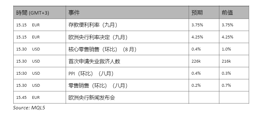 昨天公布的美国消费者物价指数 (CPI) 数据高于预测值和前值。然而,市场似乎已经消化了CPI的上涨,并且由于数据显示美国通胀依然持续,反应相对温和。相比之下,澳大利亚8月份就业数据显示就业变化显着增加,从之前的-1,400人改善至64,900人,而失业率保持不变。这一积极的就业数据为澳元提供了支撑。与此同时,所有人的目光都集中在欧洲央行(ECB)身上,因为它定于今天宣布利率决定。该公告可能为投资者提供指导,并有助于衡量欧元的强势。