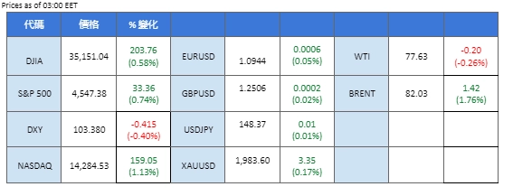 纳斯达克综合指数上涨1.10%,在美国科技板块积极情绪的推动下,继续保持看涨趋势。微软任命山姆·奥特曼(Sam Altman)领导一个新的先进人工智能研究团队,促使该股创下历史新高。英伟达(Nvidia)在发布季度业绩前股价升至历史新高,投资者预计人工智能需求增长将产生积极影响。货币政策收紧预期的缓和,也导致美国国债收益率小幅下跌,进一步推高了对美国股票的需求。