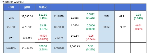 由于市场参与者预期美联储可能降息,美国国债收益率大幅下跌。美国股市多数股票大幅上涨。道琼斯工业平均指数(Dow Jones Industrial Average)收盘创下历史新高,这是自2022年1月以来的首次。标准普尔500指数和纳斯达克指数均上涨超过1%,反映出美联储暗示结束加息政策后的积极情绪。