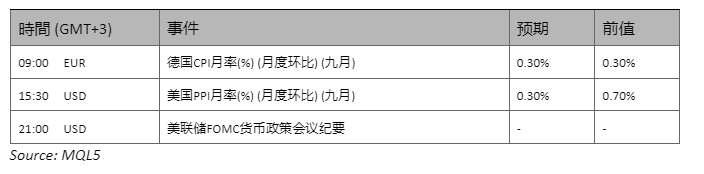 随着越来越多的美联储官员表达鸽派情绪,表明有必要将利率维持在限制性水平以遏制通胀,投资者在谨慎的市场环境中前行。在 9 月份的联邦公开市场委员会 (FOMC) 会议纪要发布之前,人们的预期越来越高,预计该会议纪要将提供有关美联储决策的见解。这种情绪营造了股市的积极氛围,导致股市上涨。与此同时,衡量市场恐惧程度的 VIX 指数跌至 10 月份低点。在中东紧张局势不断升级的情况下,金价和油价均坚守在较高水平。与此形成鲜明对比的是,中国正在制定强劲的经济刺激计划,旨在通过提高预算赤字来促进增长,这可能会提振澳元和新西兰元等代理货币。