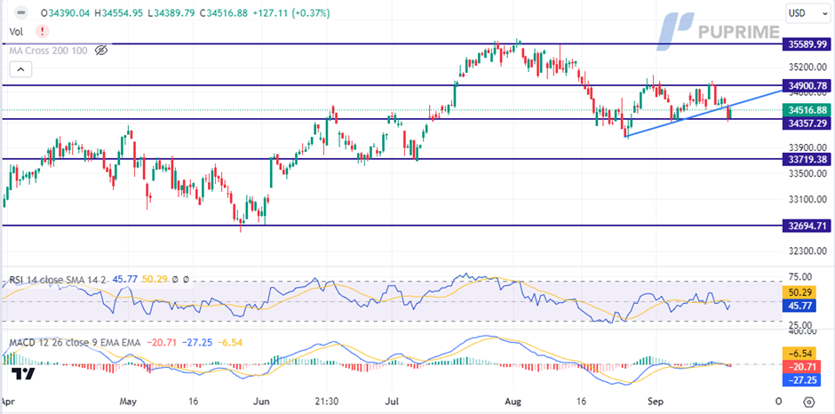 道琼斯指数正在走低,目前正在测试支撑位。MACD指标显示看跌势头增强,而相对强弱指数在46,暗示该指数在突破后可能扩大跌势,因相对强弱指数仍低于中线。