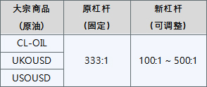 请注意,由于大宗商品(原油)产品的杠杆调整将遵循账户杠杆设置,若客户的账户杠杆设置在100:1,调整后的大宗商品(原油)也将是100:1;若客户的账户杠杆保持在500:1,调整后的大宗商品(原油)杠杆也将是500:1。因此,我们强烈建议客户在2021年2月18日前检查其账户杠杆设置,审慎评估风险承受能力和确保账户内有充足资金,并谨慎交易。