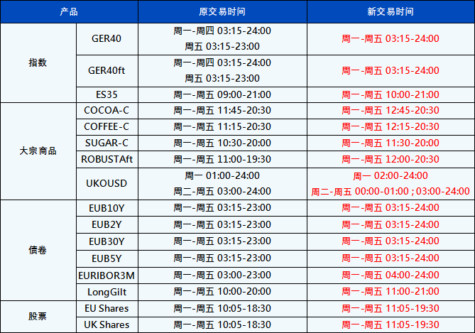 您好!由于2024年10月27日欧洲及英国冬令时间即将到来,PU Prime 部份产品交易时间由2024年10月28日起将有所调整。