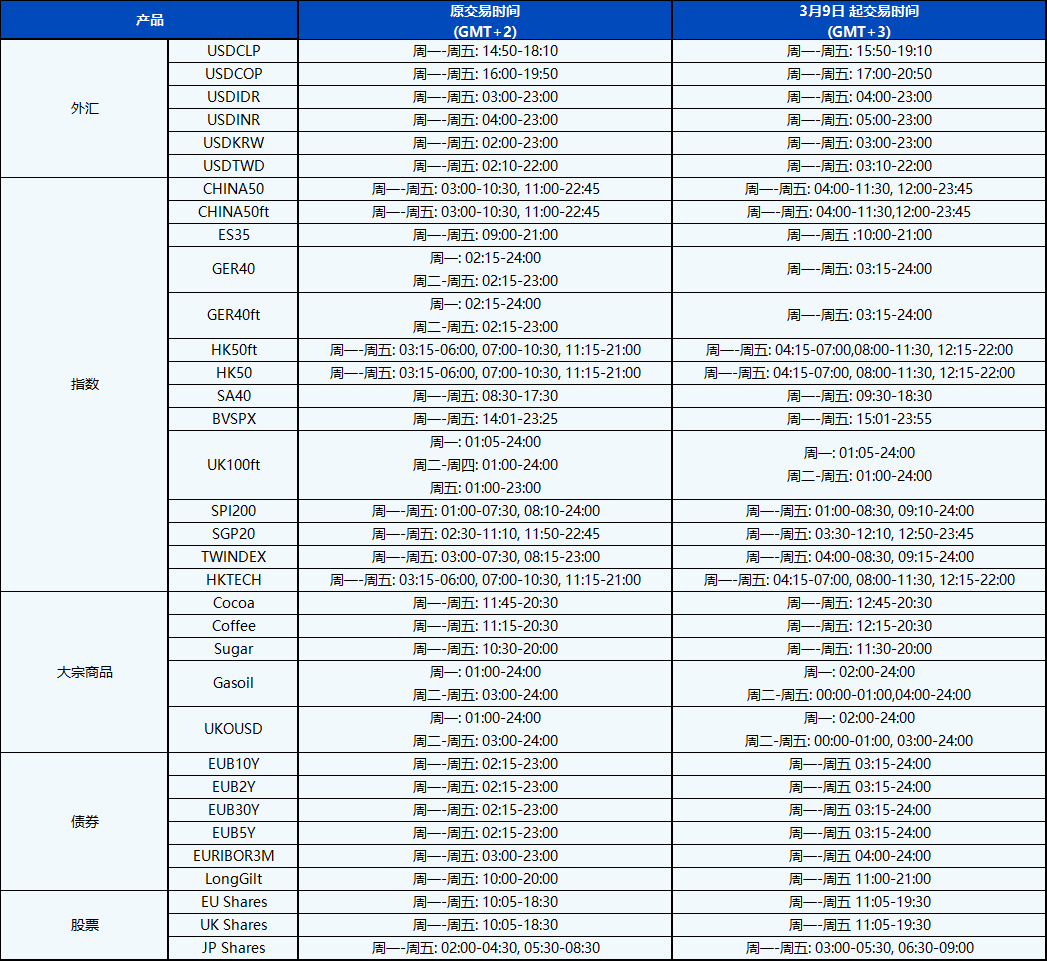 除MT4/MT5服务器时间将有所调整外,请参考下表了解涉及调整的产品情况: