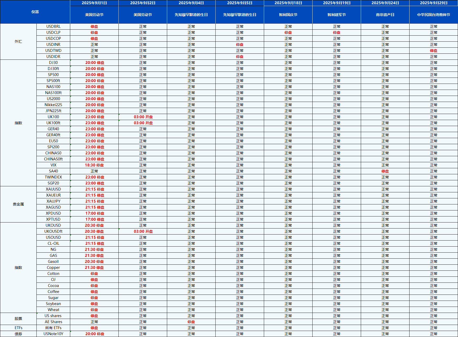 您好,受即将到来的9月份假期影响,PU Prime的交易时间将有所调整。