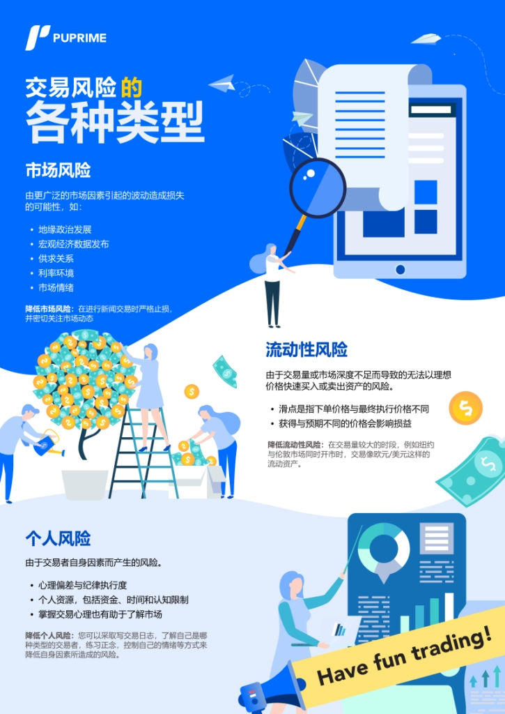 评估和识别交易风险对于有效管理交易风险和保障交易资本至关重要。交易者必须保持警惕,评估可能会影响其交易活动的各类风险。交易时需要考虑多种类型的风险,每种风险都有独特的考虑因素,需要加以解决,以下是差价合约交易者最常见的一些风险类型。